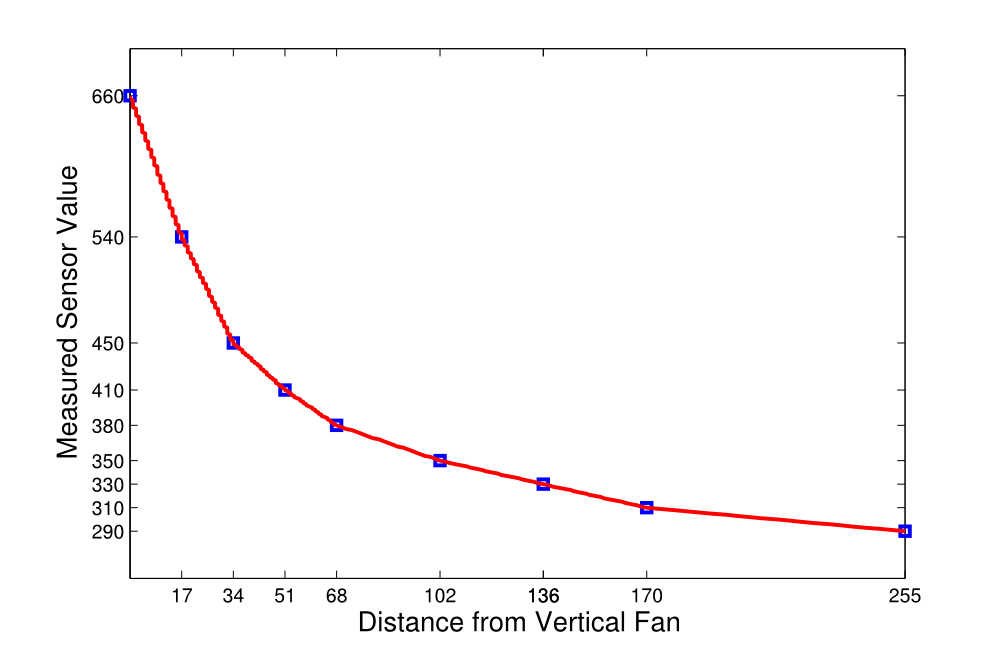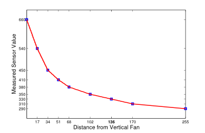 The blue squares in figure 3.4 show the measured sensor values for the down sensor for different heights of the blimp. If the down sensor touches the ground we read 660, at a virtual distance of 255 the sensor value is 290. The sensing task maps the sensor values to a distance as follows: if the sensor value is greater or equal to 660 the distance is 0, and if it is lower than 290 the distance is 255. In between 290 and 660 we use the measured mapping of sensor values to distance. However, we only have a few data point in this range. To get estimates for the other values we use linear interpolation. This way we can come up with a lookup table that maps all possible sensor values between 290 and 660 to a distance in the range of 0 to 255.