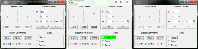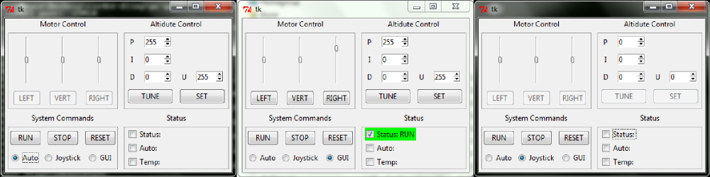 The PC user interface provides a cross platform graphical environment to allow the user to send motor commands, send system level control commands, adjust the PID controller, and steer the blimp with a game controller or joystick. It was implemented in Python using Tkinter, pygame, and pyserial. Data input and command issue is controlled with buttons, sliders, and text boxes. Figure 3.5 shows the interface in each of the three operating modes: GUI control, autopilot, and joystick.