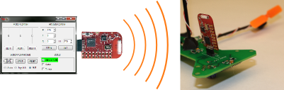 The blimp and PC communicate to each other by means of wireless communication over eZ430-RF2500 communicators. The messages are passed by UART from the sender to its attached wireless module, which sends the data wirelessly using IEEE 802.15.4 standard to the receiver module. The receiver module then passes the information over UART to the destination.