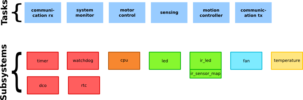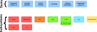 Four subsystems are related to the various timers and clock sources we have on the blimp: the watchdog timer, the real time clock, the digitally-controlled oscillator and a generic timer subsytem. The latter provides functions to start and stop a timer and to get the current value of the timer. The cpu subsystem provides functionality to enable and disable interrupts, to enter a low power mode as well as synchronization functions used to guard critical sections. Two more systems are related to the leds on the blimp. Both of them provide functions to turn leds on, off or toggle them. Finally, the fan subsystem gives an interface to control an individual fan and the temperature subsystem provides the means to read the current core temperature.