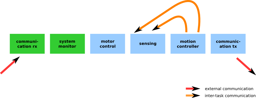 Figure 3.2 shows the six different tasks that make up the Blimp firmware. The tasks share data by using global variables and use inter-task messages for internal communication. The communication rx task receives external messages from the PC and the communication tx task sends the command response back to the PC.