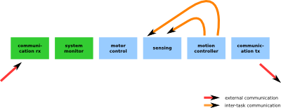 If the blimp is in an idle state, only the communication rx and the system monitor task run -- these are periodic tasks. If the blimp receives an external message, for example to run the left fan forward at speed 42, the flag pending_message of the motor control task is set. Therefore, the motor control task is run the next time it is his turn.